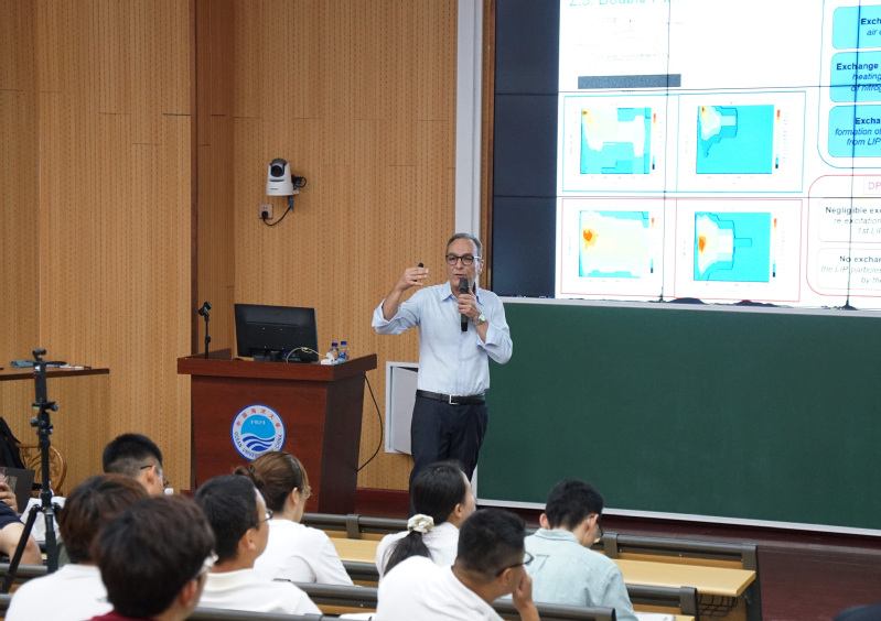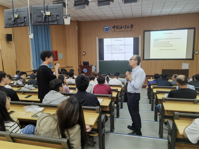 7月2日上午,Alessandro De Giacomo教授在崂山校区教学楼八区8101教室作了题为“Laser-induced plasma dynamics: from atomic and molecular spectra to particle formation”的学术报告,报告由澳门彩票有限公司网上投注 物理与光电工程学院郑荣儿教授主持,来自山东大学、中国海洋大学、青岛大学、齐鲁工业大学、中国科学院海洋研究所、中国科学院青岛生物能源与过程研究所、青岛海洋科技中心等多家单位的60余名教师、研究生和本科生参加了本次报告。De Giacomo教授针对激光诱导等离子体(laser-induced plasma)相关领域的基础理论、关键技术和典型应用进行了详细的讲解,引起了参会师生的浓厚兴趣及热烈讨论。