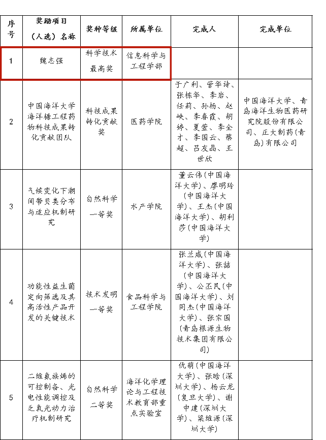 学校主持获得2023年度青岛市科学技术奖励清单