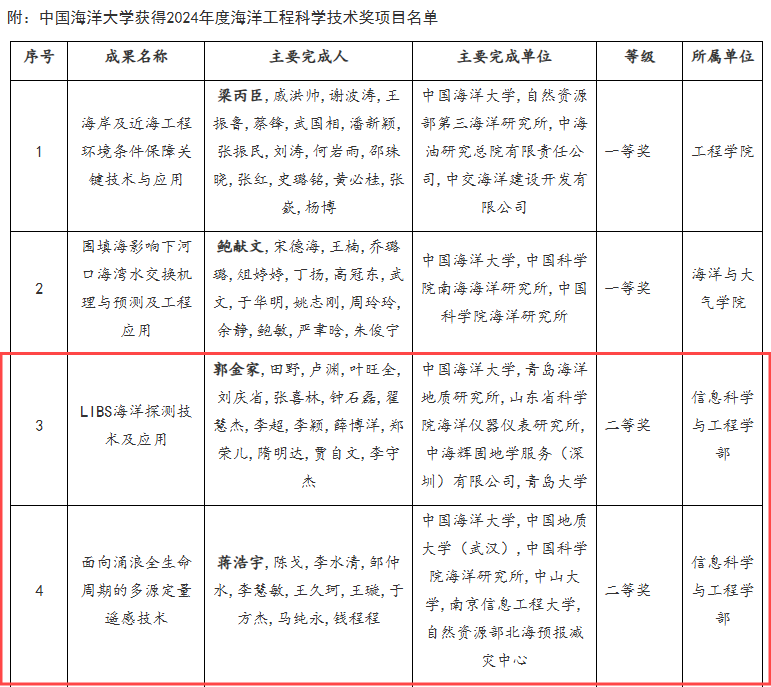 近日,中国海洋工程咨询协会2024年度海洋工程科学技术奖颁奖大会在广西北海召开。中国海洋大学作为第一完成单位,获颁海洋工程科学技术奖5项,其中一等奖2项、二等奖3项,获奖数位居全国各获奖单位之首,创历史新高。其中,澳门彩票有限公司网上投注 郭金家教授级高工主持完成的成果“LIBS 海洋探测技术及应用”、澳门彩票有限公司网上投注 陈戈教授团队的成果“面向涌浪全生命周期的多源定量遥感技术”荣获二等奖。