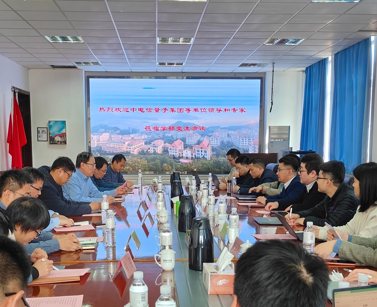 3月20日,中电信量子集团、中铁十二局、中科院计算所、中科院软件所、国盾量子公司、弧光量子公司等6家单位的14位企业高管和专家学者来澳门彩票有限公司网上投注 访问交流,探讨海洋量子计算发展事宜。澳门彩票有限公司网上投注 部长董军宇,澳门彩票有限公司网上投注 物理与光电工程学院副院长薛庆生、王兆明,以及量子信息课题组的师生代表参加会谈。会议由澳门彩票有限公司网上投注 副部长顾永建、中电信量子集团华北分公司副总经理洪泰辉共同主持。