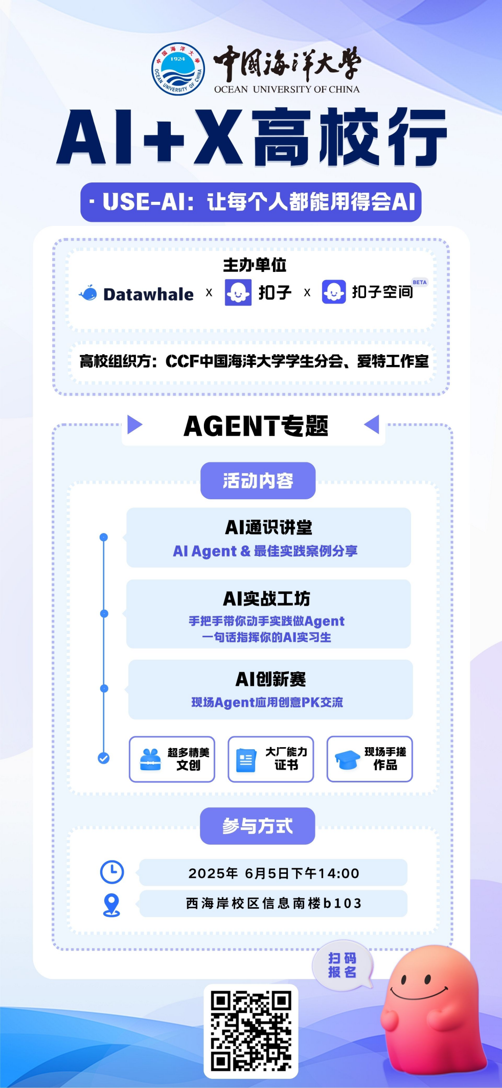 在人工智能飞速发展的今天,AI Agent正在成为推动行业变革的关键力量。为了助力同学们提升AI技术能力,紧跟前沿技术趋势,CCF中国海洋大学学生分会、爱特工作室携手Datawhale开源学习社区,将于2025年6月5日下午14:00在西海岸校区信息南楼b103启动“AI+X高校行Agent专题”活动。一场知识与实践的盛宴,一次创新思维的碰撞,一次探索AI无限可能的奇妙之旅,等你来赴约!