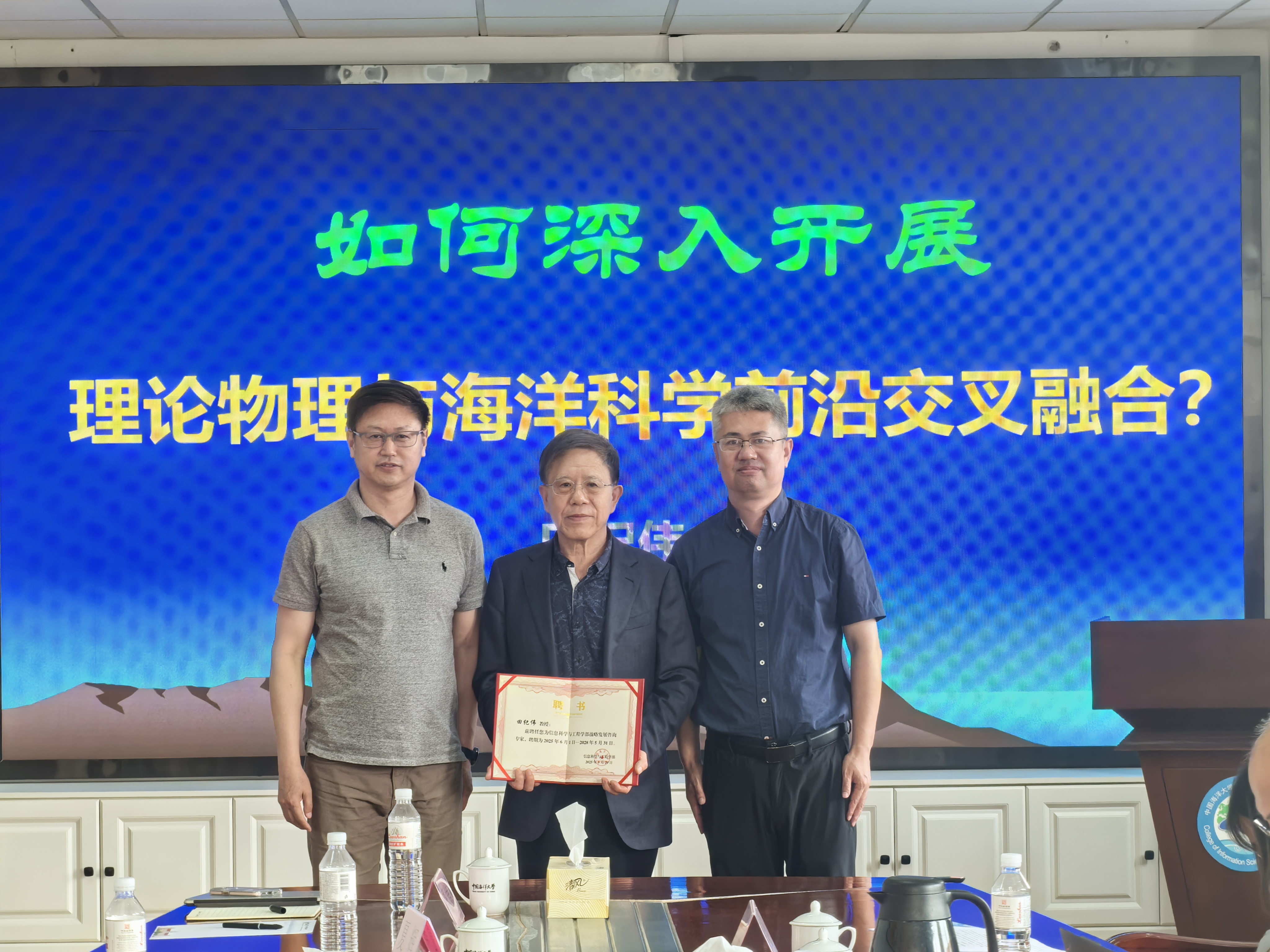 聘任仪式上,张永胜代表澳门彩票有限公司网上投注 向田纪伟教授颁发聘书,热烈欢迎田纪伟教授指导澳门彩票有限公司网上投注 工作。张永胜指出,当前信息学科与海洋学科深度融合处于关键期,亟需顶尖智慧引领方向,田纪伟教授在物理海洋学领域成就卓著,必将为澳门彩票有限公司网上投注 优化学科布局、推动创新发展注入强大动力。田纪伟教授表示将紧密围绕国家海洋强国建设重大需求,结合自身专长,积极建言献策,为提升澳门彩票有限公司网上投注 核心竞争力贡献力量。