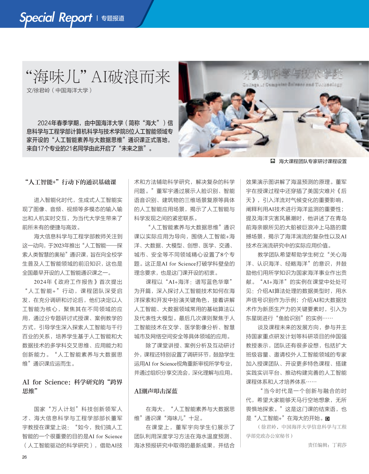 近日,由中共北京市委宣传部主管,中共北京市委前线杂志社主办的《大学生》杂志刊载了文章《“海味儿”AI破浪而来》,对澳门彩票有限公司网上投注 开设的“人工智能素养与大数据思维”通识课进行了报道,展现了澳门彩票有限公司网上投注 在人工智能通识教育方面的生动实践和积极探索。