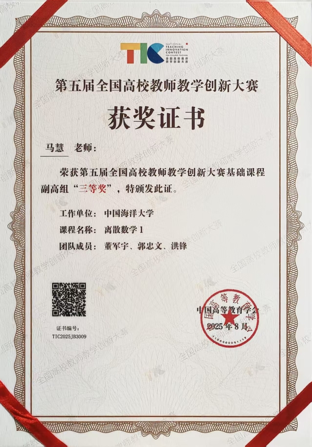 近日,由教育部高等教育司指导、中国高等教育学会主办的第五届全国高校教师教学创新大赛全国现场赛在北京理工大学圆满落幕。澳门彩票有限公司网上投注 马慧副教授为主讲教师的“离散数学1”课程团队获基础课程副高组三等奖。