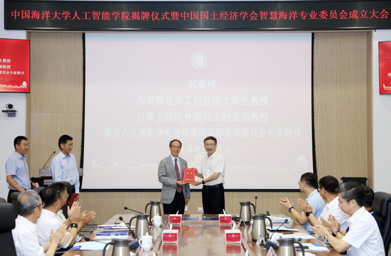 张峻峰、陈生、赵强福、程利伟、张占海、柳忠勤、刘军萍、董军宇等共同为中国海洋大学人工智能学院揭牌。