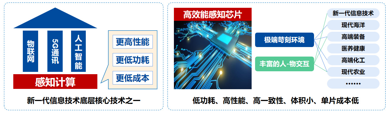 满足市场需求,提升产业竞争力。近年来,物联网、5G、人工智能等信息技术迅猛发展,感知计算是以上新一代信息技术的底层核心技术之一,随着应用场景的不断丰富,覆盖范围的快速增强,性能、功耗、成本成为制约这项技术发展的主要限制瓶颈,感存算一体融合的高效能感知芯片技术具有低功耗、高性能、高一致性、体积小、单片成本低等优点,是有效突破这些限制瓶颈的技术方向,特别是在解决极端苛刻环境和丰富人-物交互下的感知计算问题上,更需要高效能的感知计算芯片,在推动新一代信息技术、现代海洋等产业的新旧动能转换和高质量发展中有着重要意义。