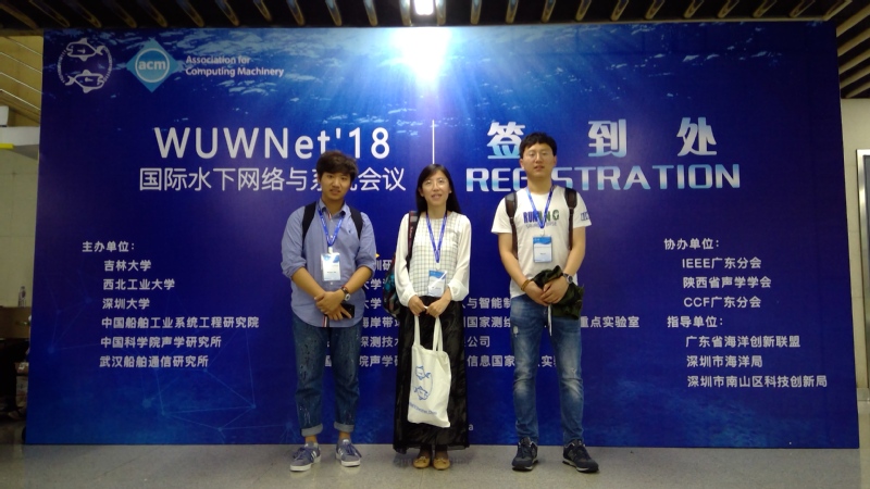由于新冠疫情原因,INFOCOM 2020改为线上虚拟会议,无法现场参会。图为李阅同学与论文合作作者之一尹浩宇同学,随同他们的导师刘颖健老师参加WUWNet’18时的合影(右一为李阅同学,中间为刘颖健老师,左一为尹浩宇同学)。