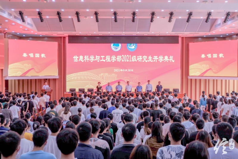 开学典礼在悠扬雄壮的国歌中拉开序幕,研究生与会师生精神饱满,歌声庄重。