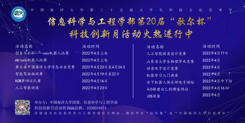 澳门彩票有限公司网上投注 第二十届“歌尔杯”科技创新月活动包涵第七届中国海洋大学信息安全竞赛、山东省大学生物理学术竞赛、人工智能讲座、人工智能棋类设计竞赛、水下机器人俱乐部电子讲坛、从0搭建自己的博客网站、ios讲座、人工智能讲座、ACM集训赛、“歌尔杯”高校VR/AR挑战赛等子活动。相较于往年,今年活动的种类、数量均达到历史新高。澳门彩票有限公司网上投注 团委联合学院学生会和相关科技社团广泛宣传,通过学院班级群通知、信印象、信息青年等其他校内媒体平台以及横幅喷绘等方式,在全校范围内引起了广泛关注。