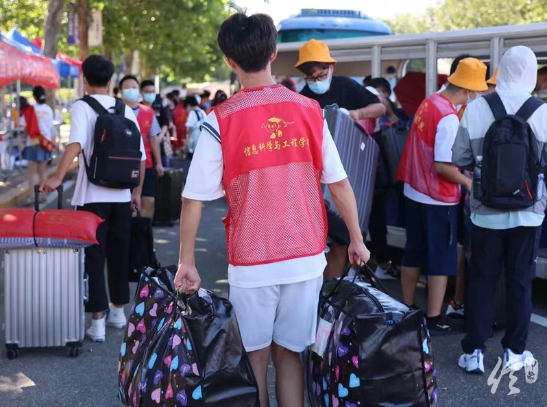 蓝色帐篷遮蔽烈日,红白围杆筑起城墙,疫情防控常态化形势下,迎新的校门少了一丝热闹,多了一份秩序、一份温馨,口罩虽遮住了志愿者的面庞,却遮不住他们热情的目光。行李虽重,无畏辛劳;路途虽远,共赴前程。
