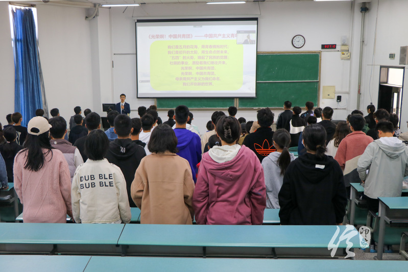 首先,全体成员奏唱中国共产主义青年团团歌《光荣啊,中国共青团》。