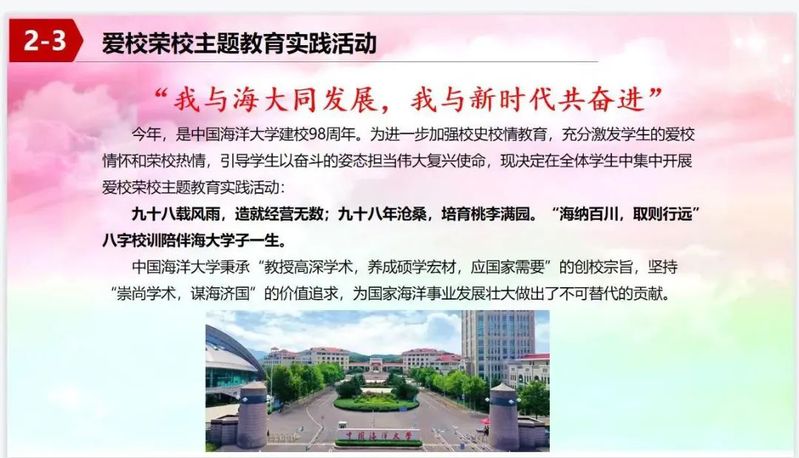 2022年10月25日,正值中国海洋大学98周年校庆。98年来,中国海洋大学与中华民族的觉醒和奋起、与新中国的建设和改革发展同呼吸、共命运,形成了海大人“崇尚学术,谋海济国”的价值追求和“海纳百川,取则行远”的校训精神,谱写了一曲奋斗不懈、发展壮大的蓝色华章。激励着一代又一代中国海大人矢志不渝地耕耘海洋,服务国家,为海洋事业的发展做出了不可替代的卓越贡献。为进一步加深班级同学的爱校情怀和荣校热情,2021级计算机硕士7班团支部开展了以“我与海大同发展,我与新时代共奋进”为主题的团日活动。采取线上的方式,积极组织同学们对校史馆进行参观并将海大近年来的取得的辉煌成就进行分享,让大家充分了解海大的办学历程、办学理念以及卓越成就。同学们纷纷发出愿景“今朝我以海大为荣,愿他日海大以我为荣光!”。另外2021级光电科学与工程团支部等党支部也以各自的方式展开关于爱校荣校的主题团日活动。